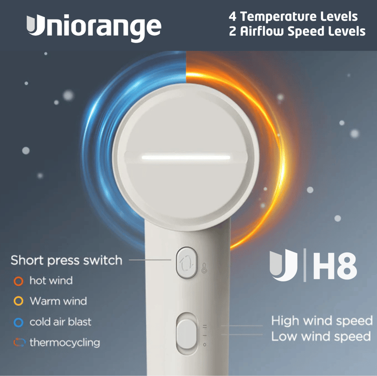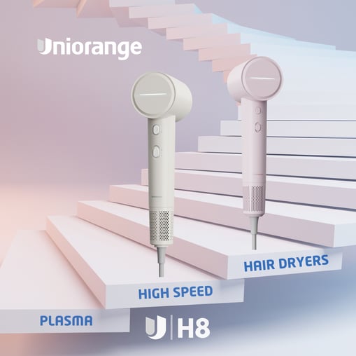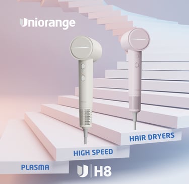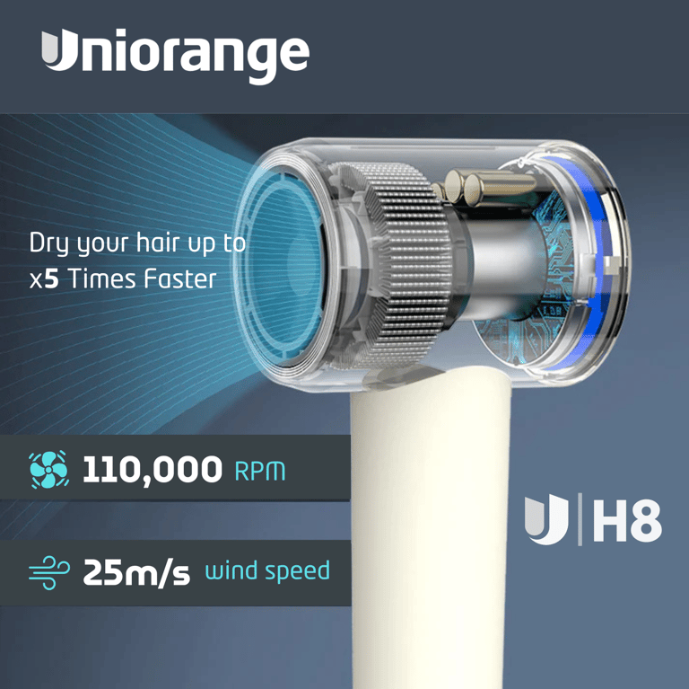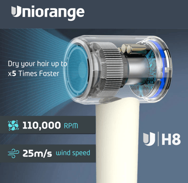 Discover the Uniorange H8, a high-speed hair dryer with 110,000 RPM, intelligent temperature control, and plasma technology for quick, healthy, and frizz-free drying.