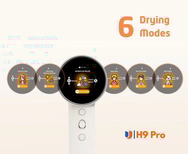 6 Blowing Modes: From Long Hair to Short Hair, Children's Mode for gentle drying, and even a unique Pet Mode for your beloved companions, the H9 Pro offers tailored solutions for every member of your household. The smart display provides intuitive one-touch switching.